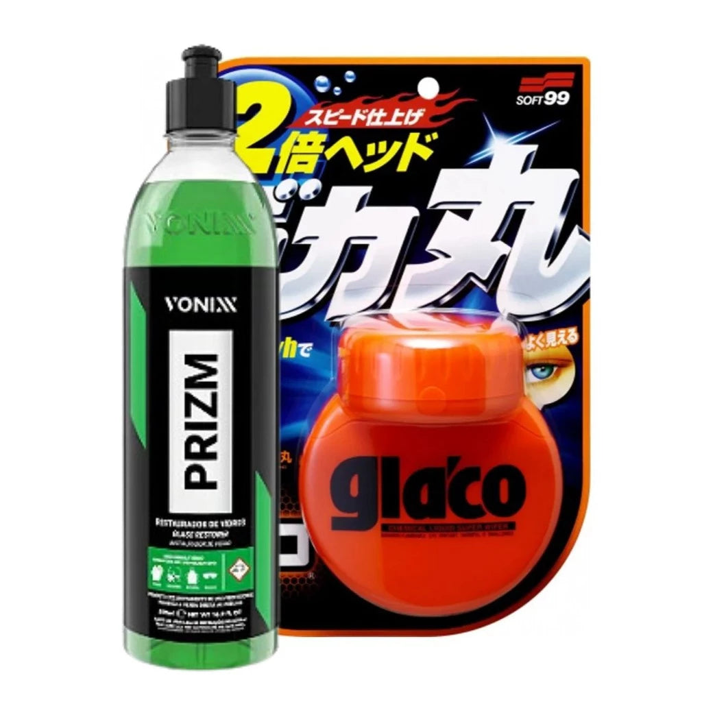 Tenha a visibilidade perfeita em qualquer situação com o nosso kit de limpeza e proteção de vidros. O combo Prizm + Glaco Big é a solução definitiva para remover as manchas mais difíceis e garantir a máxima proteção, aumentando sua segurança e conforto ao dirigir.